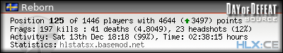 | Rank | Server | Kills | % | Ratio | Deaths | K:D | Headshots | Percentage of Headshots | % | HS:K |