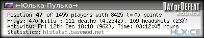 | Rank | Server | Kills | % | Ratio | Deaths | K:D | Headshots | Percentage of Headshots | % | HS:K |