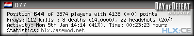 | Rank | Server | Kills | % | Ratio | Deaths | K:D | Headshots | Percentage of Headshots | % | HS:K |