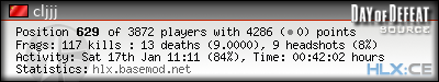 | Rank | Server | Kills | % | Ratio | Deaths | K:D | Headshots | Percentage of Headshots | % | HS:K |