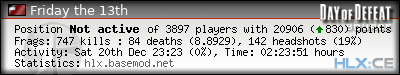 | Rank | Server | Kills | % | Ratio | Deaths | K:D | Headshots | Percentage of Headshots | % | HS:K |
