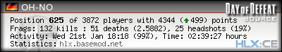 | Rank | Server | Kills | % | Ratio | Deaths | K:D | Headshots | Percentage of Headshots | % | HS:K |