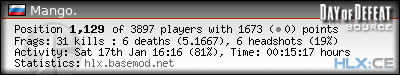 | 1 | »» GunGame only! // by www.BASEMOD.net [EU] | 26 | 83.87% | 4 | 6.5000 | 6 | 100.00% | 0.2308 | ||