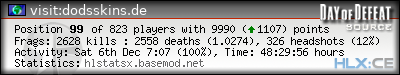 | Rank | Victim | Kills | % | Ratio | Deaths | % | Ratio | K:D | Headshots | % | Ratio | HS:K |