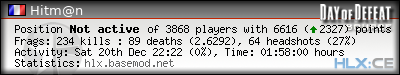 | Rank | Server | Kills | % | Ratio | Deaths | K:D | Headshots | Percentage of Headshots | % | HS:K |