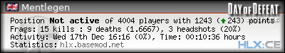 | Rank | Map | Kills | % | Ratio | Deaths | % | Ratio | K:D | Headshots | % | Ratio | HS:K |