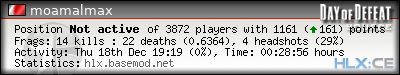 | Rank | Map | Kills | % | Ratio | Deaths | % | Ratio | K:D | Headshots | % | Ratio | HS:K |