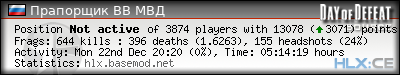 | Rank | Server | Kills | % | Ratio | Deaths | K:D | Headshots | Percentage of Headshots | % | HS:K |