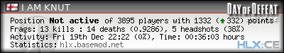 | Rank | Server | Kills | % | Ratio | Deaths | K:D | Headshots | Percentage of Headshots | % | HS:K |