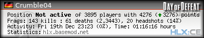 | Rank | Victim | Kills | % | Ratio | Deaths | % | Ratio | K:D | Headshots | % | Ratio | HS:K |