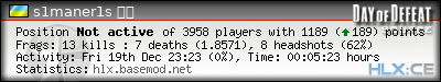 | Rank | Map | Kills | % | Ratio | Deaths | % | Ratio | K:D | Headshots | % | Ratio | HS:K |
