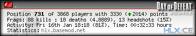 | Rank | Server | Kills | % | Ratio | Deaths | K:D | Headshots | Percentage of Headshots | % | HS:K |