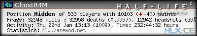 | Rank | Server | Kills | % | Ratio | Deaths | K:D | Headshots | Percentage of Headshots | % | HS:K |