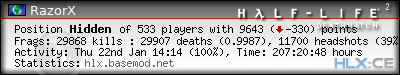 | Rank | Server | Kills | % | Ratio | Deaths | K:D | Headshots | Percentage of Headshots | % | HS:K |