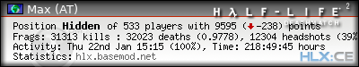 | Rank | Server | Kills | % | Ratio | Deaths | K:D | Headshots | Percentage of Headshots | % | HS:K |