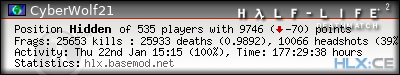 | Rank | Server | Kills | % | Ratio | Deaths | K:D | Headshots | Percentage of Headshots | % | HS:K |