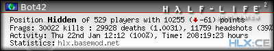 | Rank | Server | Kills | % | Ratio | Deaths | K:D | Headshots | Percentage of Headshots | % | HS:K |