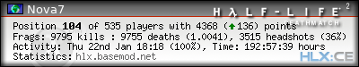 | Rank | Server | Kills | % | Ratio | Deaths | K:D | Headshots | Percentage of Headshots | % | HS:K |