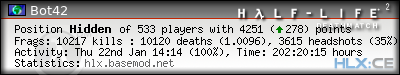 | Rank | Server | Kills | % | Ratio | Deaths | K:D | Headshots | Percentage of Headshots | % | HS:K |