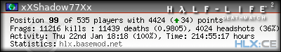 | Rank | Server | Kills | % | Ratio | Deaths | K:D | Headshots | Percentage of Headshots | % | HS:K |