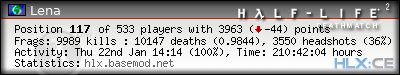 | Rank | Server | Kills | % | Ratio | Deaths | K:D | Headshots | Percentage of Headshots | % | HS:K |