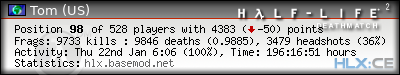 | Rank | Server | Kills | % | Ratio | Deaths | K:D | Headshots | Percentage of Headshots | % | HS:K |