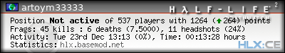| Rank | Server | Kills | % | Ratio | Deaths | K:D | Headshots | Percentage of Headshots | % | HS:K |