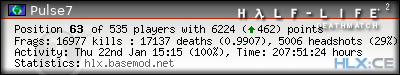 | Rank | Server | Kills | % | Ratio | Deaths | K:D | Headshots | Percentage of Headshots | % | HS:K |