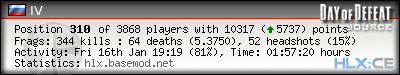 | Rank | Server | Kills | % | Ratio | Deaths | K:D | Headshots | Percentage of Headshots | % | HS:K |