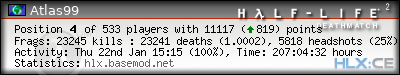 | Rank | Server | Kills | % | Ratio | Deaths | K:D | Headshots | Percentage of Headshots | % | HS:K |
