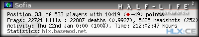 | Rank | Server | Kills | % | Ratio | Deaths | K:D | Headshots | Percentage of Headshots | % | HS:K |