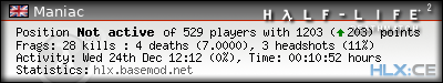 | Rank | Server | Kills | % | Ratio | Deaths | K:D | Headshots | Percentage of Headshots | % | HS:K |