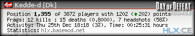 | Rank | Server | Kills | % | Ratio | Deaths | K:D | Headshots | Percentage of Headshots | % | HS:K |