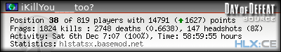 | Rank | Server | Kills | % | Ratio | Deaths | K:D | Headshots | Percentage of Headshots | % | HS:K |