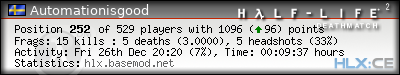 | Rank | Server | Kills | % | Ratio | Deaths | K:D | Headshots | Percentage of Headshots | % | HS:K |