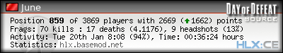 | Rank | Server | Kills | % | Ratio | Deaths | K:D | Headshots | Percentage of Headshots | % | HS:K |