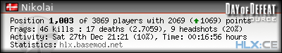 | Rank | Server | Kills | % | Ratio | Deaths | K:D | Headshots | Percentage of Headshots | % | HS:K |