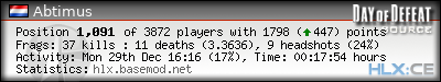 | Rank | Server | Kills | % | Ratio | Deaths | K:D | Headshots | Percentage of Headshots | % | HS:K |