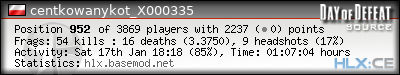 | Rank | Server | Kills | % | Ratio | Deaths | K:D | Headshots | Percentage of Headshots | % | HS:K |