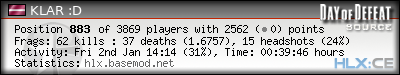 | Rank | Server | Kills | % | Ratio | Deaths | K:D | Headshots | Percentage of Headshots | % | HS:K |