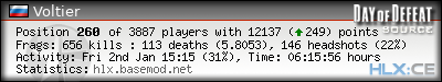 | Rank | Server | Kills | % | Ratio | Deaths | K:D | Headshots | Percentage of Headshots | % | HS:K |