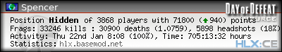 | Rank | Server | Kills | % | Ratio | Deaths | K:D | Headshots | Percentage of Headshots | % | HS:K |
