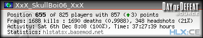 | Rank | Server | Kills | % | Ratio | Deaths | K:D | Headshots | Percentage of Headshots | % | HS:K |