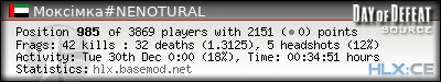 | Rank | Victim | Kills | % | Ratio | Deaths | % | Ratio | K:D | Headshots | % | Ratio | HS:K |
