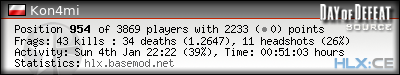| Rank | Victim | Kills | % | Ratio | Deaths | % | Ratio | K:D | Headshots | % | Ratio | HS:K |