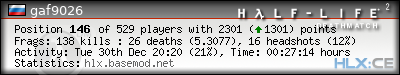 | Rank | Server | Kills | % | Ratio | Deaths | K:D | Headshots | Percentage of Headshots | % | HS:K |