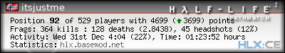 | Rank | Server | Kills | % | Ratio | Deaths | K:D | Headshots | Percentage of Headshots | % | HS:K |