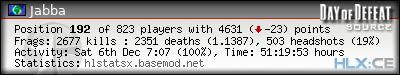 | Rank | Server | Kills | % | Ratio | Deaths | K:D | Headshots | Percentage of Headshots | % | HS:K |