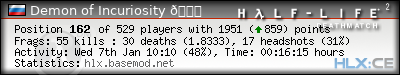 | Rank | Server | Kills | % | Ratio | Deaths | K:D | Headshots | Percentage of Headshots | % | HS:K |
