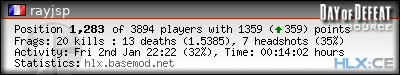 | Rank | Server | Kills | % | Ratio | Deaths | K:D | Headshots | Percentage of Headshots | % | HS:K |